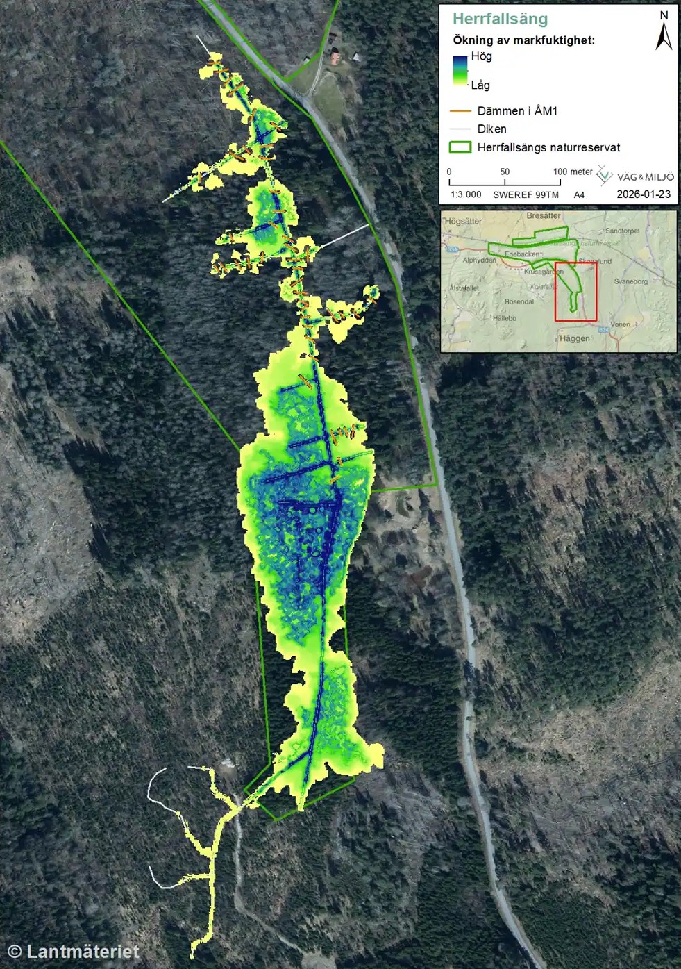 Väg & Miljö har under flera år tagit fram återvätningsanalyser för dikade våtmarker i Örebro län. Samtliga områden som behandlats har varit naturreservat som pekats ut för återställning och där våra modeller ligger till grund för framtida restaurering. Modellen har reviderats genom åren och levererar utdata i form av markfuktighet, vattendjup, flödesförändringar och dämmen.